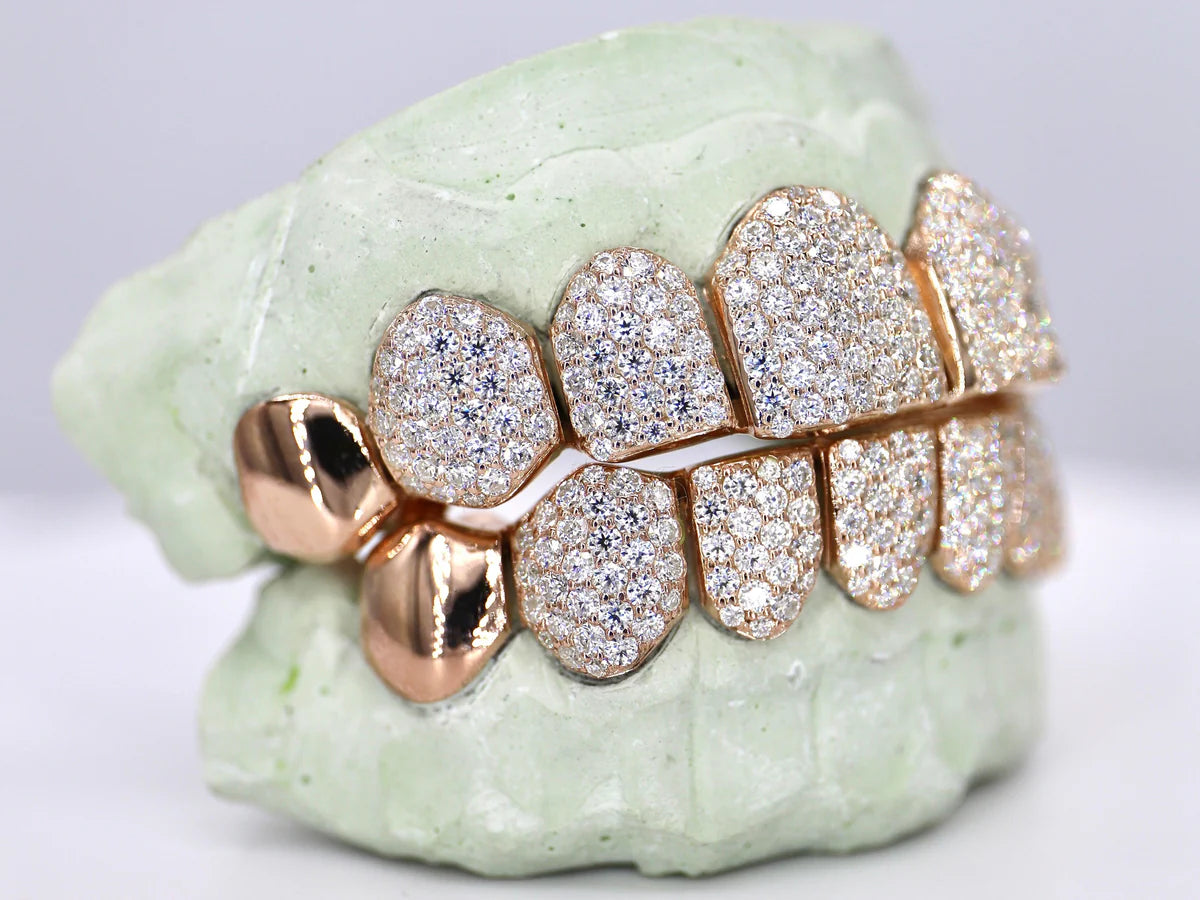 Enhance your style with our Top or Bottom 8 Rose Gold teeth jewellery. With a luxurious rose gold finish, add a touch of elegance to your outfit. Get iced out and stand out from the crowd with our exquisite design. Elevate your look today.